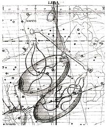 (전갈자리의 집게발) 이 별의 구성원은 오른쪽에 있는 세 3등성과 왼쪽에 보이는 4등성이다. 황도 위의 별자리를 12개로 만들기 위해 전갈자리를 나눠서 천칭자리로 독립시켰다고는 하지만 모양이 영 어색하다.