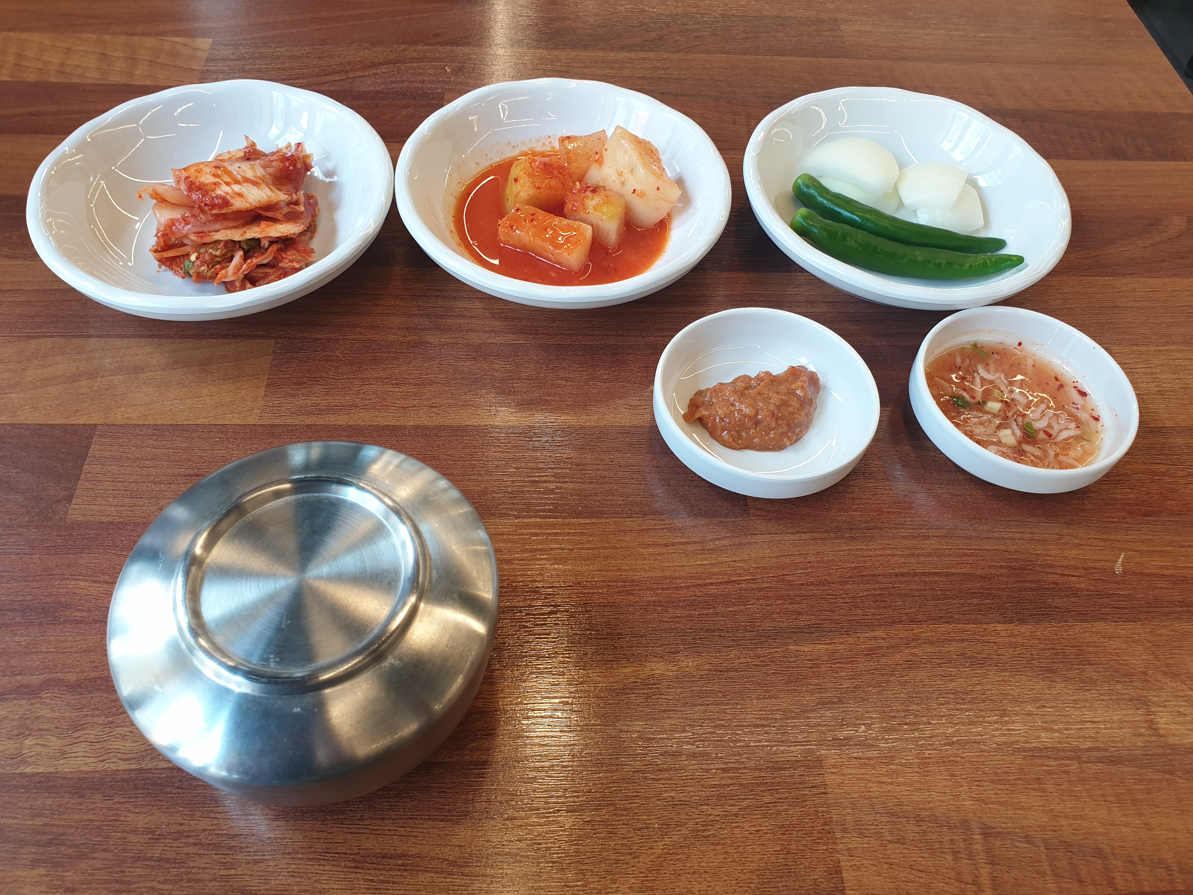 이 집의 기본반찬이다. 기본으로 반찬을 셋팅해주고 부족하면 본인이 가져다 먹는 방식이다. 그리고 사진에는 나와있지 않지만 다진 양념과 들깨가루가 준비되어 있다.