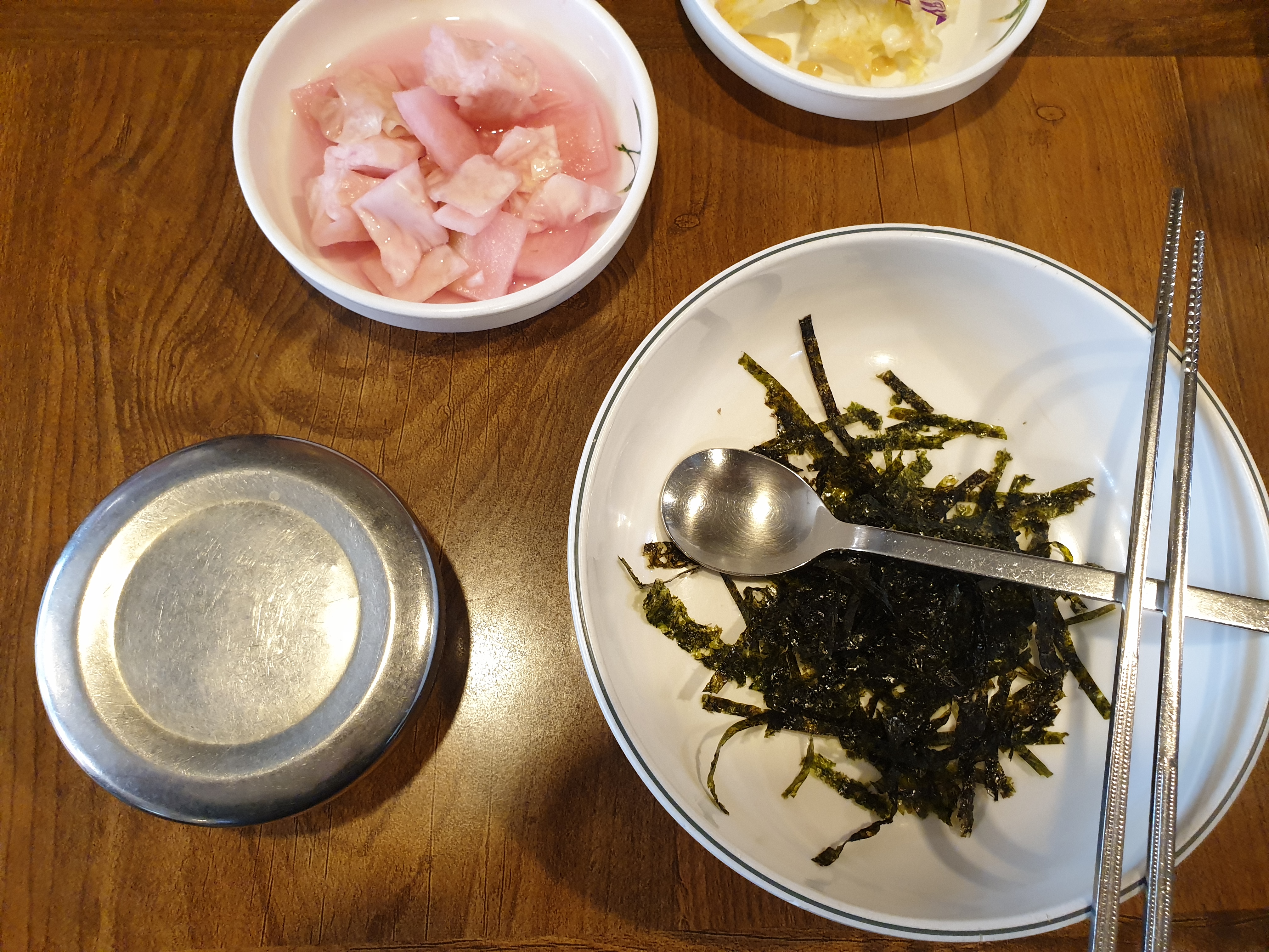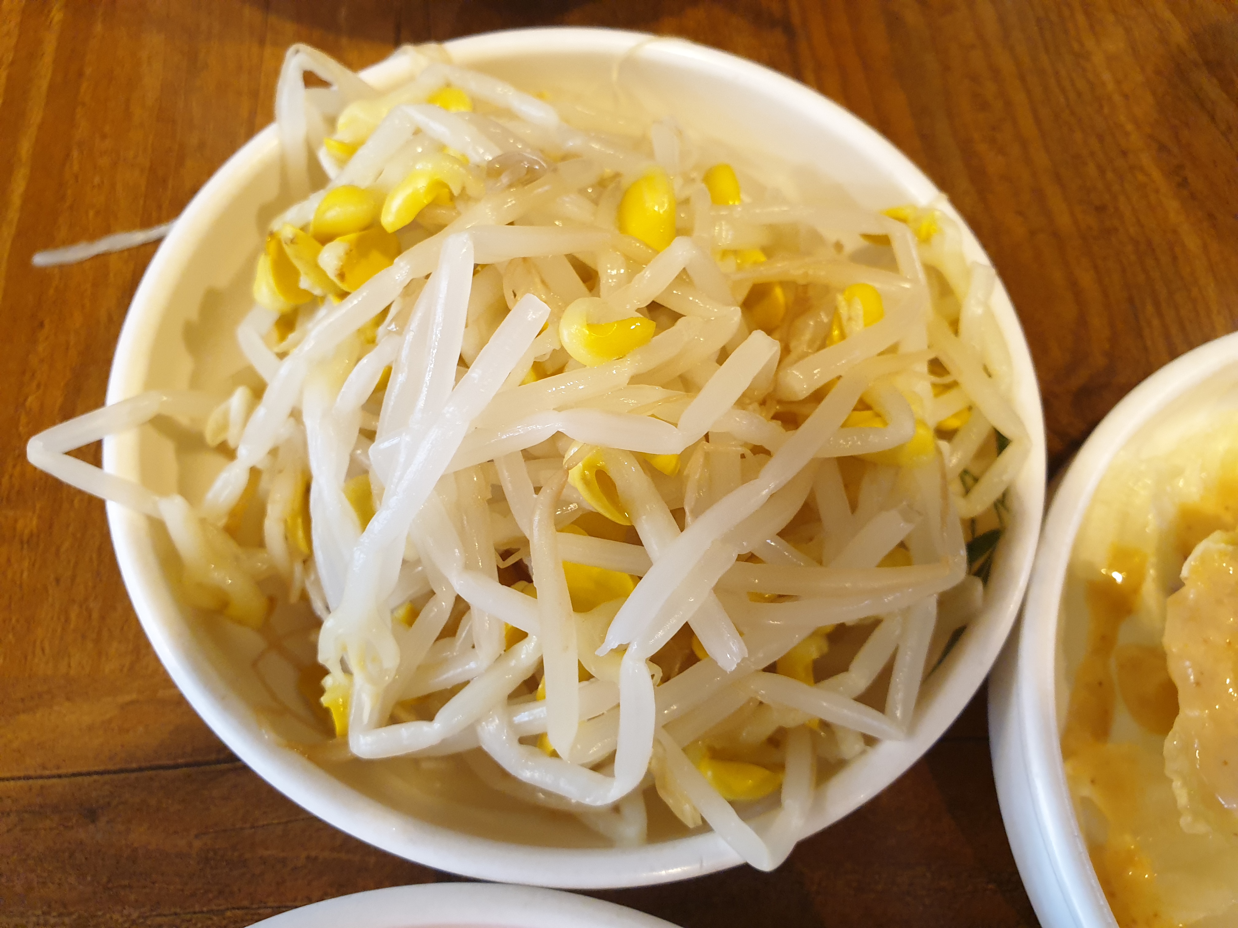 기본 반찬 입니다. 콩나물은 낙지볶음과 같이 밥과 비벼먹을 때 넣으면 됩니다. 그리고 낙지 비빔밥과 단무지가 잘 어울립니다.