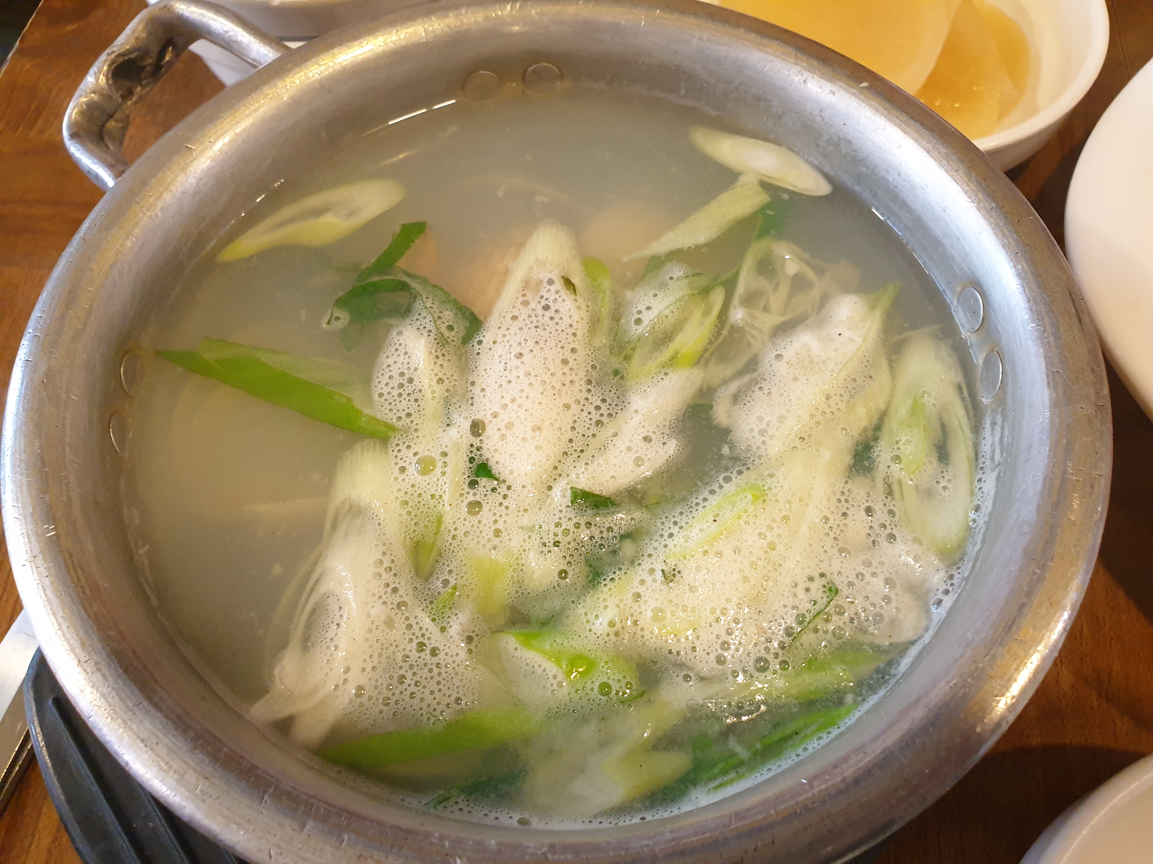 매운 무교동 낚지와 완전 잘 어울리는 조개탕입니다. 정말 시원합니다. 집에서 조개를 사서 끊여보면 이렇게 진한 맛이 나지 않는데 비법이 뭔지 궁금합니다. 조개탕에 들어가는 조개는 모시조개보다는 큰데 무슨 조갠지는 모르겠네요.