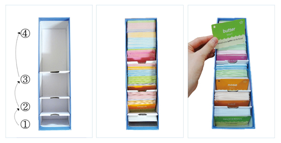 라이트너 박스는 5개의 칸으로 구성되어 있고 뒤로 갈수록 공간의 폭이 넓다. 앞 부분보다 뒷 부분에 많은 양의 카드를 넣어둘 수 있다. 라이트너 박스를 이용하여 단어 공부를 하는 방법을 소개한다.