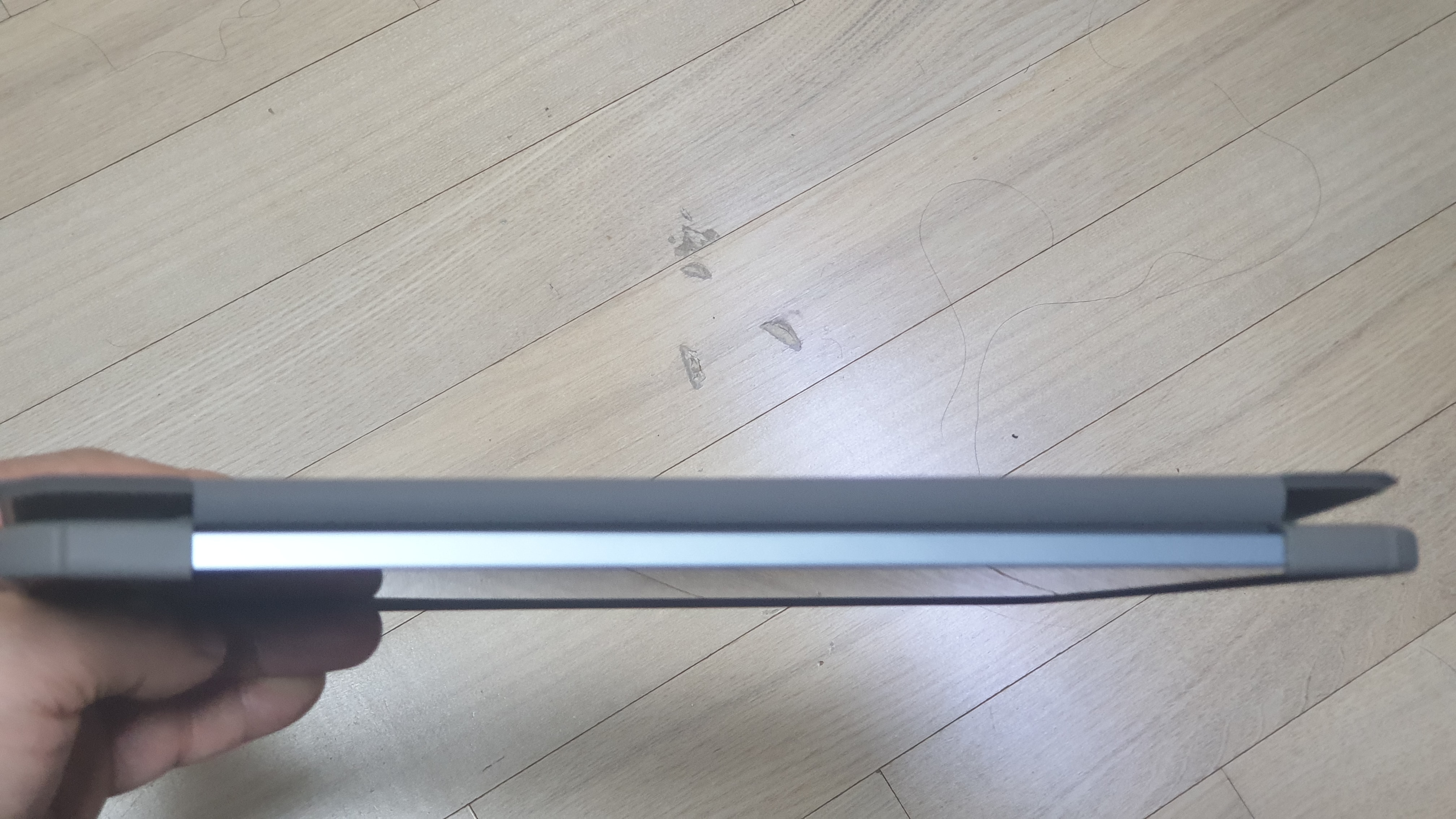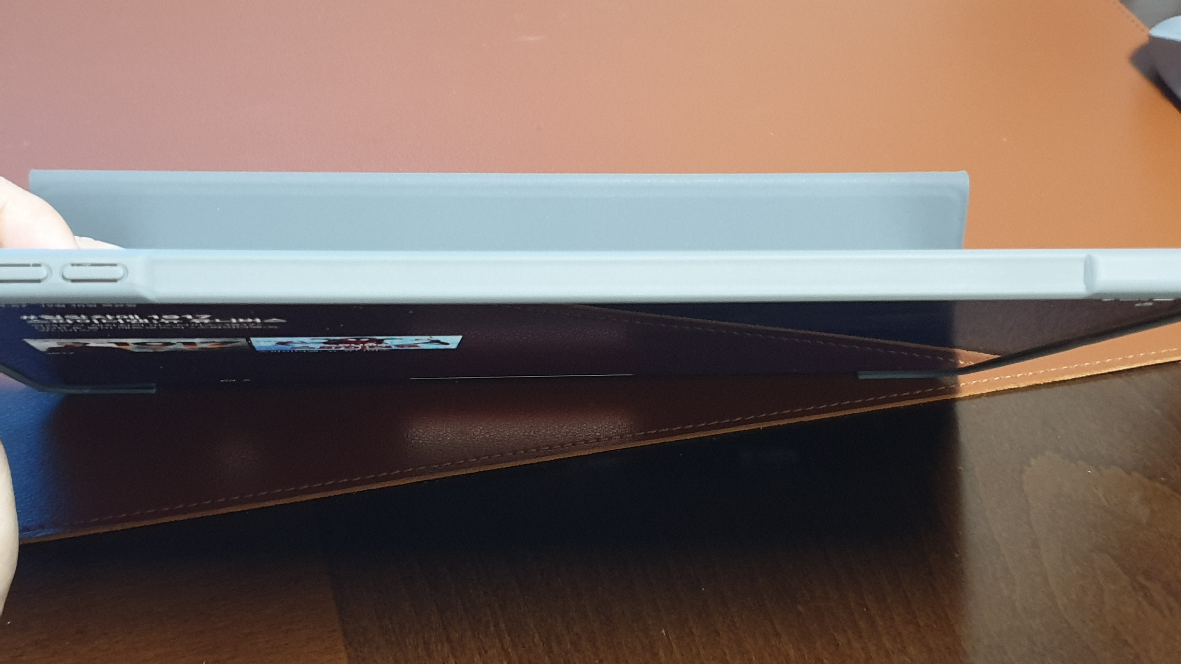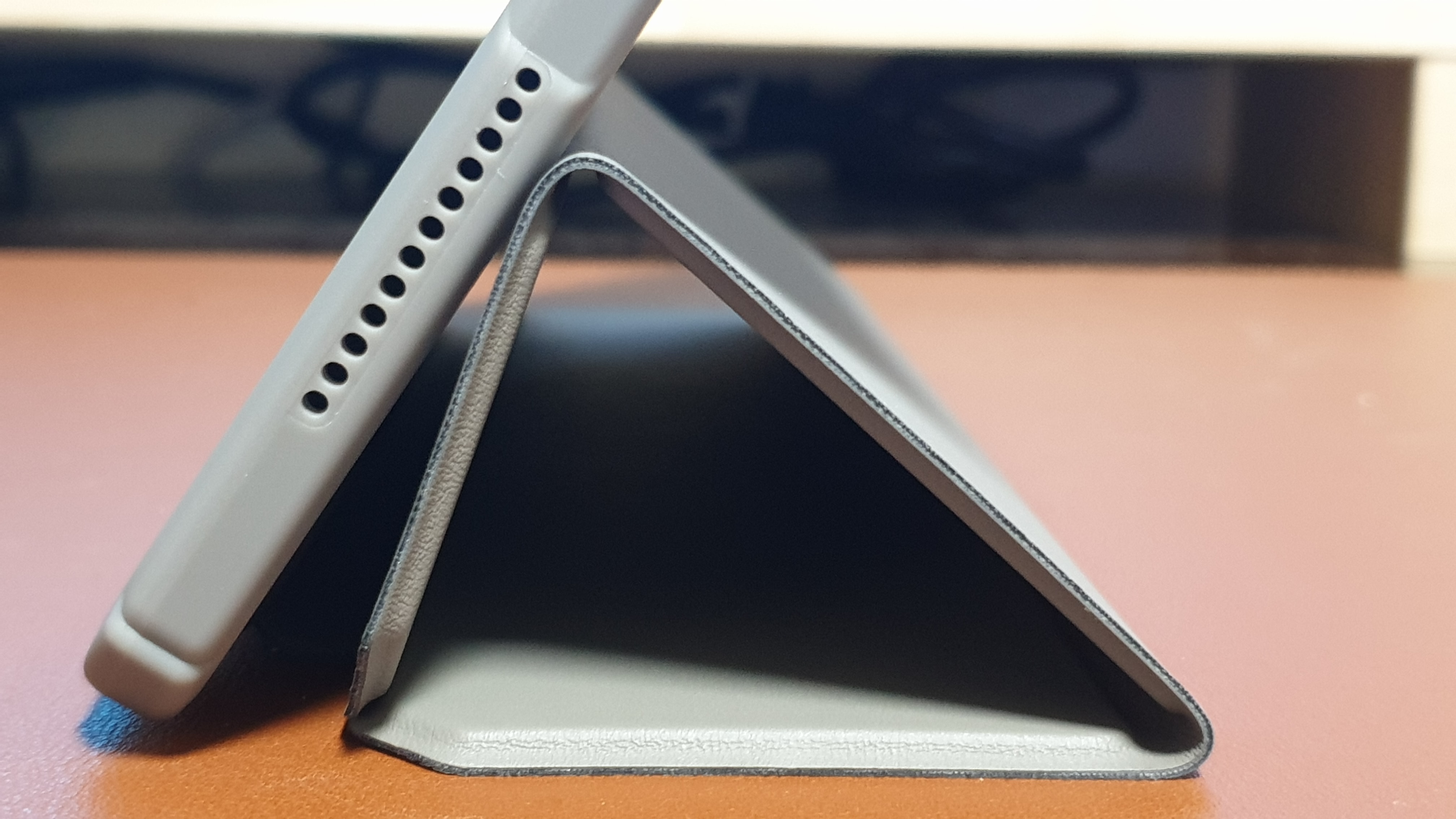 거치 각도가 좀 애매했다. 위의 사진에 나와있는 각도는 도서관이나 카페에서 사용하다 보면 빛 반사가 심한 각도다. 그래서 뒤면에 각도를 높이기 위해 이것저것 끼워 넣다 보면 쓰러지기 일쑤다. 이런 스타일의 케이스에 최고 단점이다.