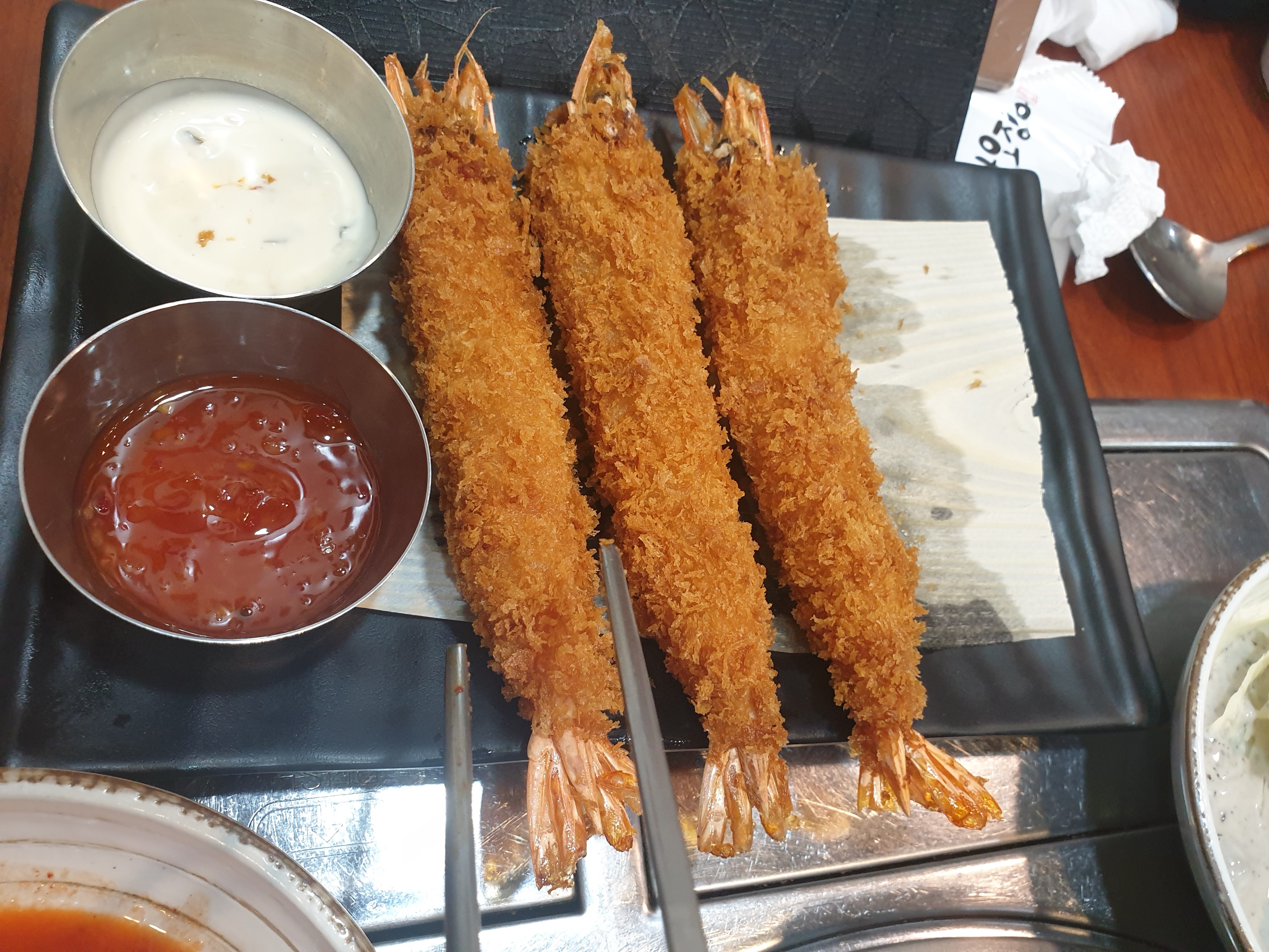 생각 외로 새우튀김도 맛있었다. 눅눅하지 않고 바싹바싹하게 튀겨 나온다. 칠리소스나 사진에 나온 흰 소스(생선 가스 시키면 나오는 소스)와 곁들여 먹으면 된다.