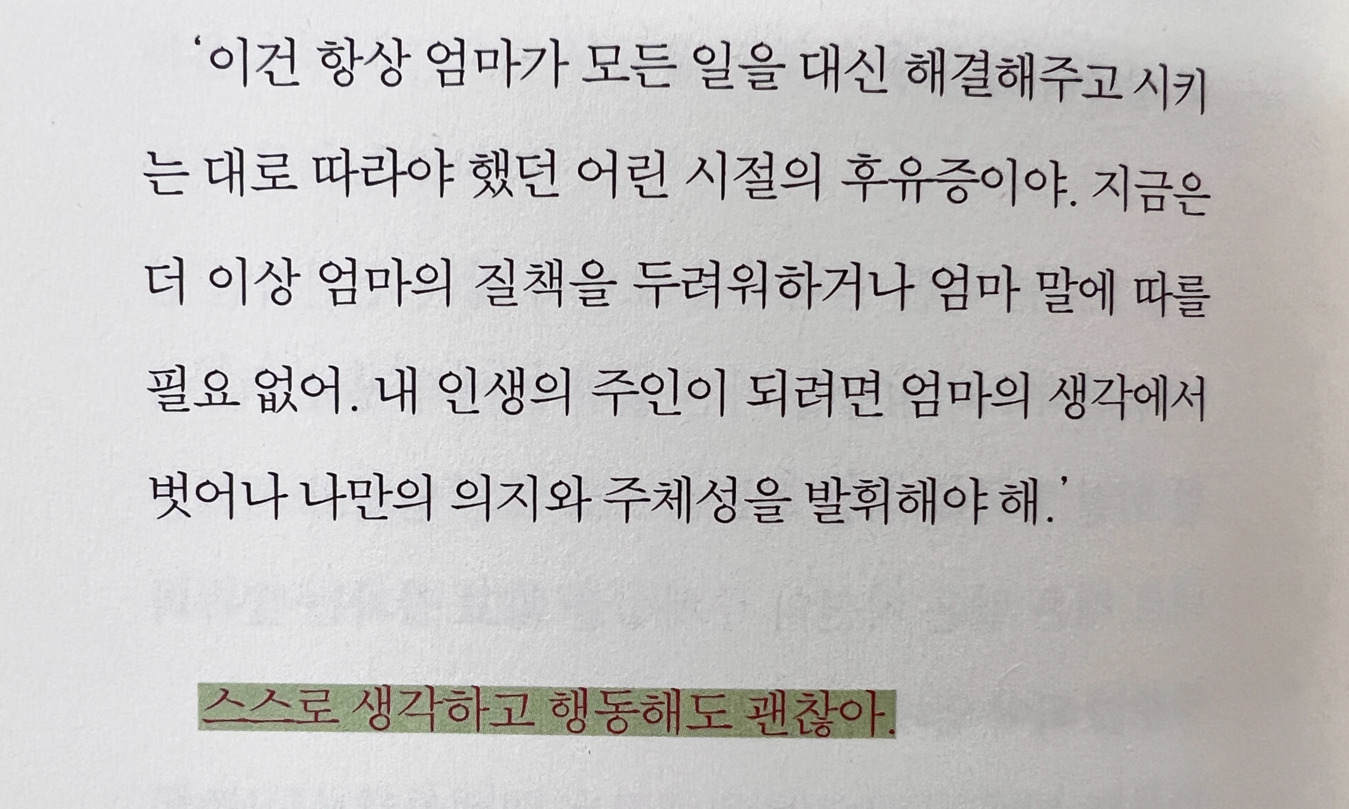 '부모에게 효도해야 한다'는 생각에 얽매이지 마세요. 죄책감은 엄마가 심어놓은 가짜 감정일 뿐이라는 걸 기억하세요. 그래서 우리는 진짜 감정을 찾아야 해요. 그 감정이 무엇인지 찾는 과정은 자유롭게 생각하고 행동하는 데 중요한 첫 걸음이 될 수 있어요.