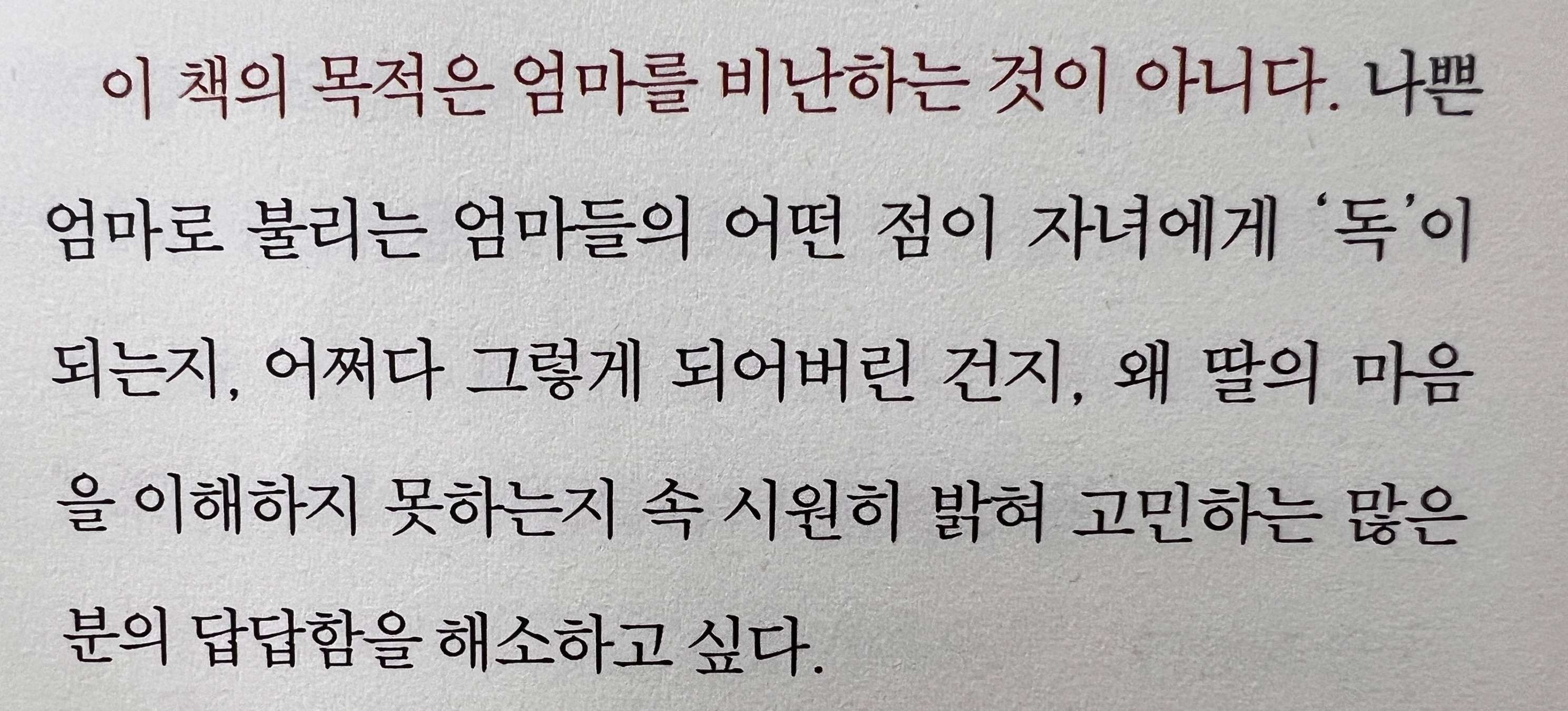 이 책의 목적은 엄마를 비난하는 것이 아니다. 나쁜 엄마로 불리는 엄마들의 어떤 점이 자녀에게 ‘독’이 되는지, 어쩌다 그렇게 되어버린 건지, 왜 딸의 마음을 이해하지 못하는지 속 시원히 밝혀 고민하는 많은분의 답답함을 해소하고 싶다. 당신은 나쁘지 않다. 혼자만 괴로운 게 아니다. 이렇게 위로하며 이제부터 어떻게 생각하고 행동해야 하는지, 어떻게 엄마에게 벗어나 자유로워질 수 있는지 알려주고 싶을 뿐이다. - p.10