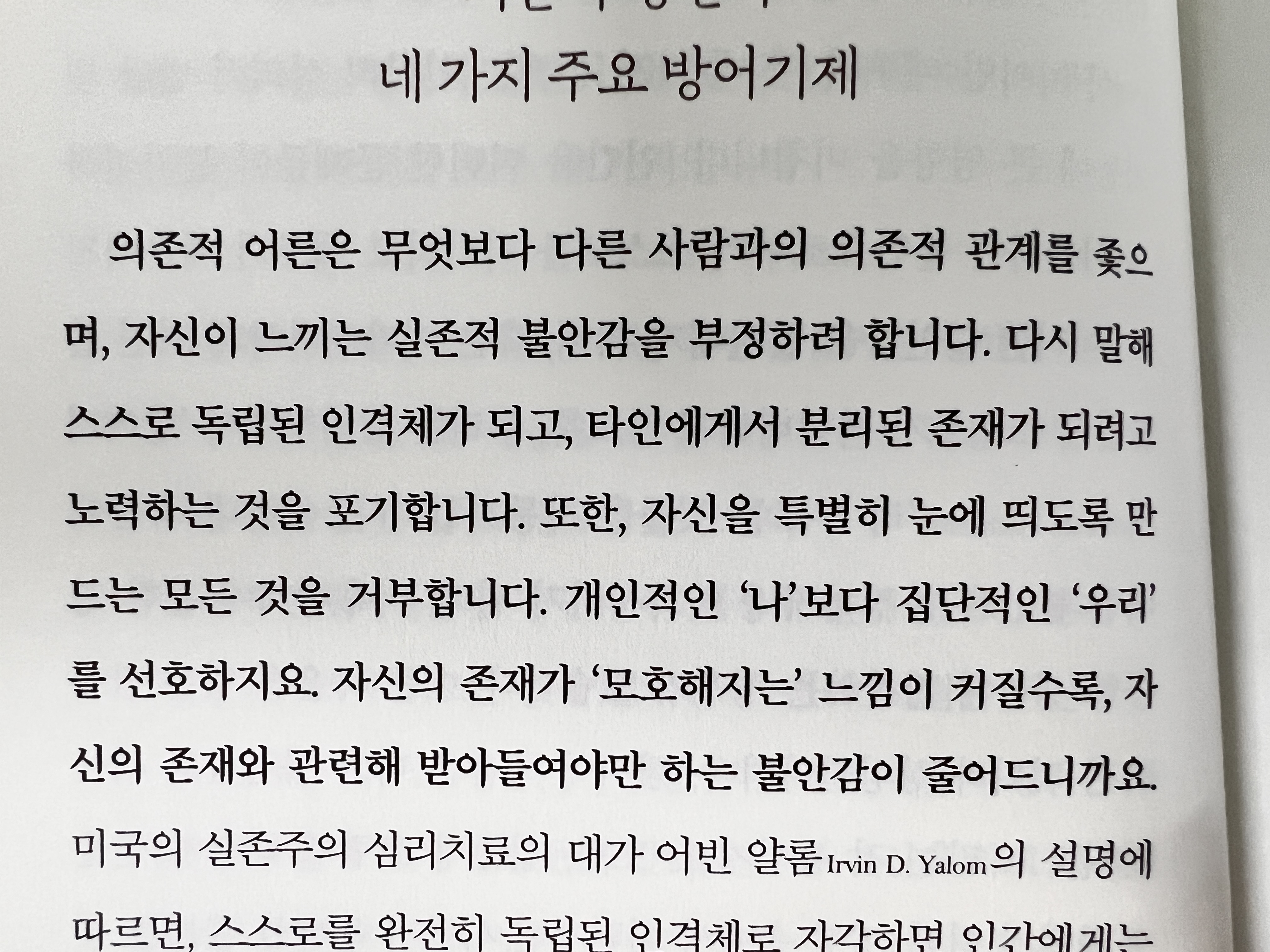 미국의 실존주의 심리치료의 대가 어빈 얄롬 Irvin D. Yalom의 설명에 따르면, 스스로를 완전히 독립된 인격체로 자각하면 인간에게는 ‘자신의 나약함과 고독에 대한 두려운 감정’이 일어난다고 합니다. 의존적 성인의 경우, 뒤로 물러서서 분리-개별화를 포기한 채 다른 사람과 의존적 관계를 맺거나 자신의 존재를 숨기고, 모든 일을 다른 사람에게 맡기려 애쓰며, 이 감정을 누그러뜨리려고 합니다.