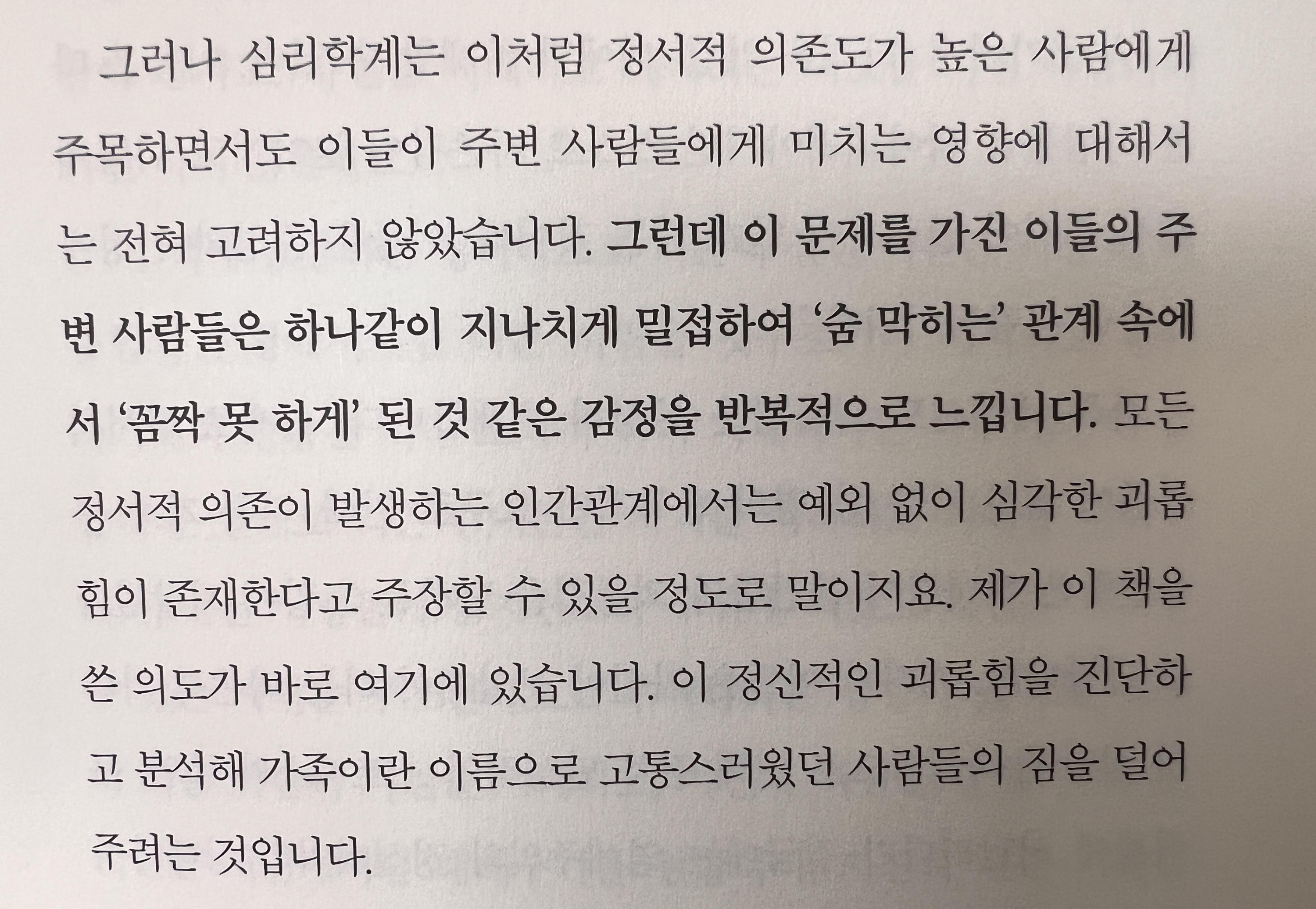 심리학계는 이처럼 정서적 의존도가 높은 사람에게 주목하면서도 이들이 주변 사람들에게 미치는 영향에 대해서는 전혀 고려하지 않았습니다. 그런데 이 문제를 가진 이들의 주변 사람들은 하나같이 지나치게 밀접하여 ‘숨 막히는’ 관계 속에서 ‘꼼짝 못 하게’ 된 것 같은 감정을 반복적으로 느낍니다. 모든 정서적 의존이 발생하는 인간관계에서는 예외 없이 심각한 괴롭힘이 존재한다고 주장할 수 있을 정도로 말이지요. 제가 이 책을 쓴 의도가 바로 여기에 있습니다. 이 정신적인 괴롭힘을 진단하고 분석해 가족이란 이름으로 고통스러웠던 사람들의 짐을 덜어주려는 것입니다.