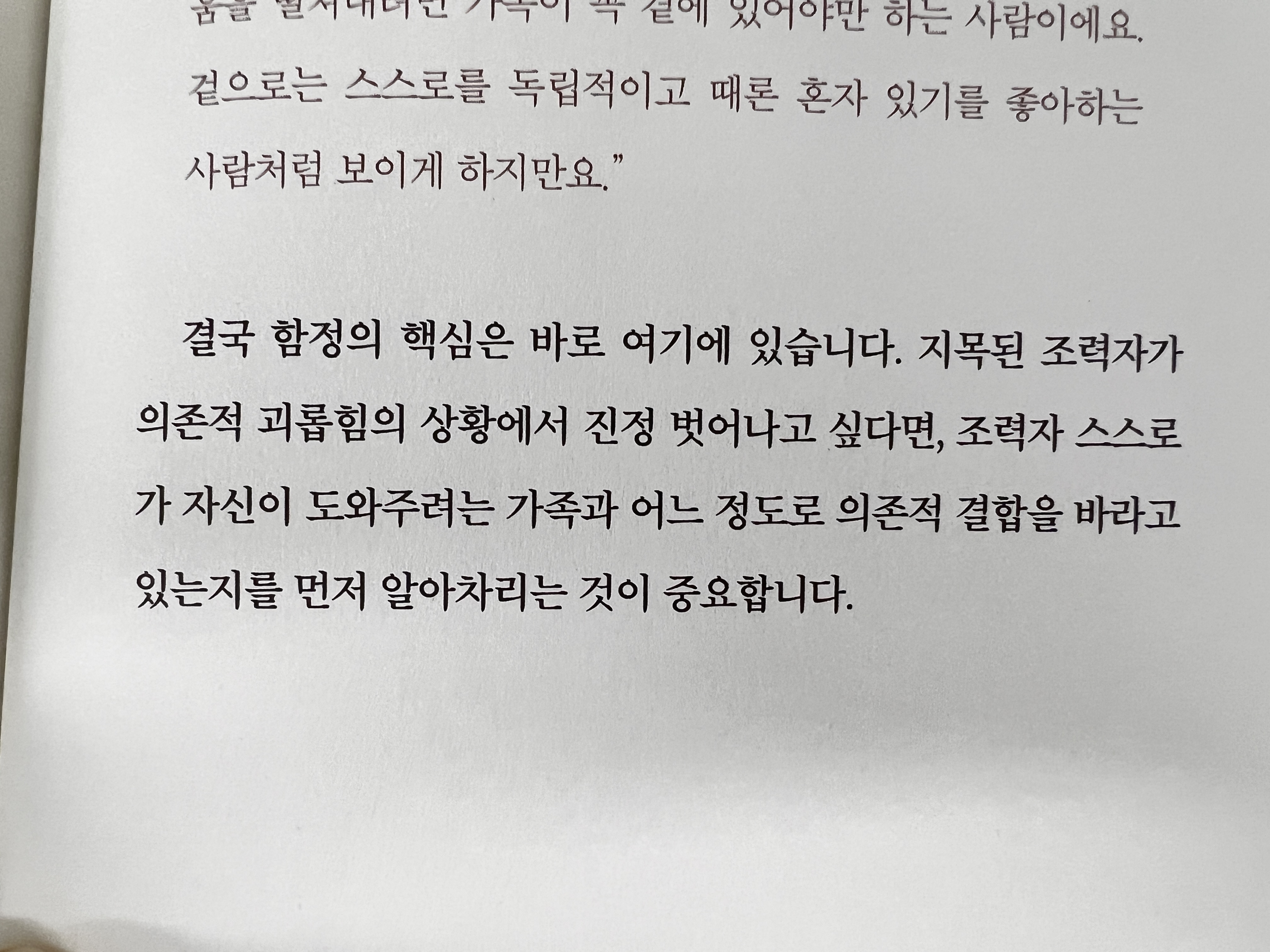 그런데 이러한 맥락에서 보았을 때, ‘지목된 주 조력자는 항상 의존적 어른과 가장 긴밀한 관계를 유지하는 사람’이라는 사실이 의미하는 바는 단 하나입니다. 지목된 조력자는 정서적 의존성이 높은 가족과 가까이 붙어 지내야만 하는 사람이라는 것입니다. 즉, 그 조력자 역시 의존적 어른만큼이나 의존적 관계에 매달린다는 것이지요. 결국 지목된 조력자 또한, 스스로 깨닫지 못하지만 분리 및 유기에 대한 두려움에 사로잡힌 정서적 의존성이 높은 어른인 것입니다. … 겉으로 내보이지는 않지만 주 조력자 스스로 고통스럽고 파괴적인 의존적 관계를 감내할 정도로 의존적 관계에 대한 욕구가 강렬한 것입니다.