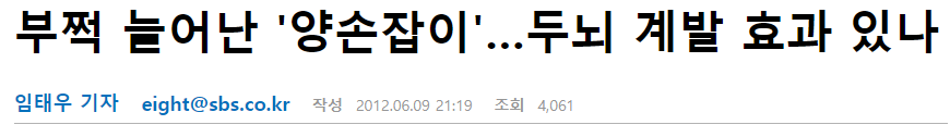 구글 검색에서 찾아낸 링크다. SBS 기자가 쓴 내용에 따르면 최근 양손을 사용하는 아이들이 부쩍 늘었으며 양손 사용이 두뇌 발달에 좋기 때문이란 것이 이유이다. 하지만 기사 말미에 한양대 신경외과 교수는 이렇게 말한다.