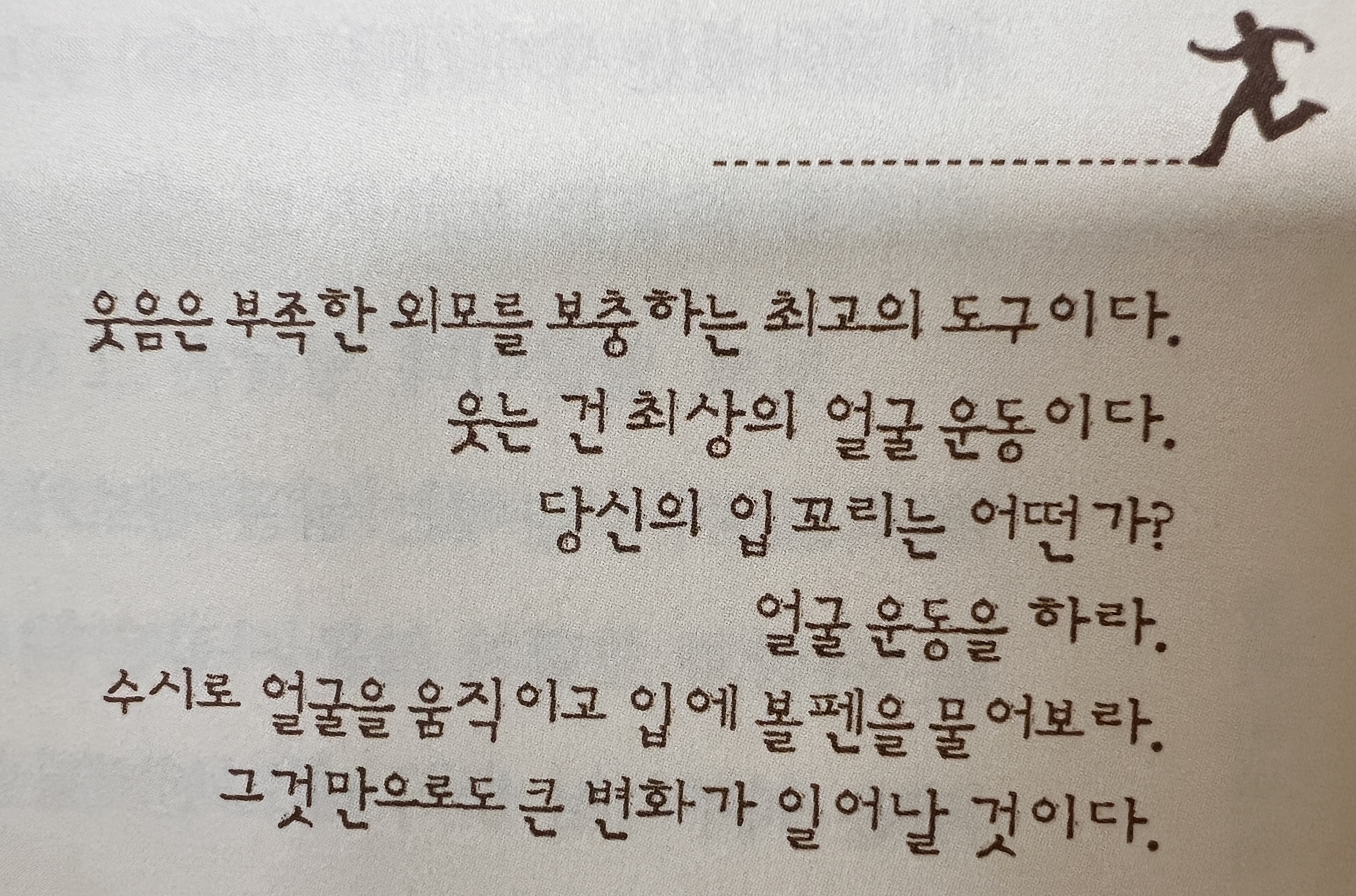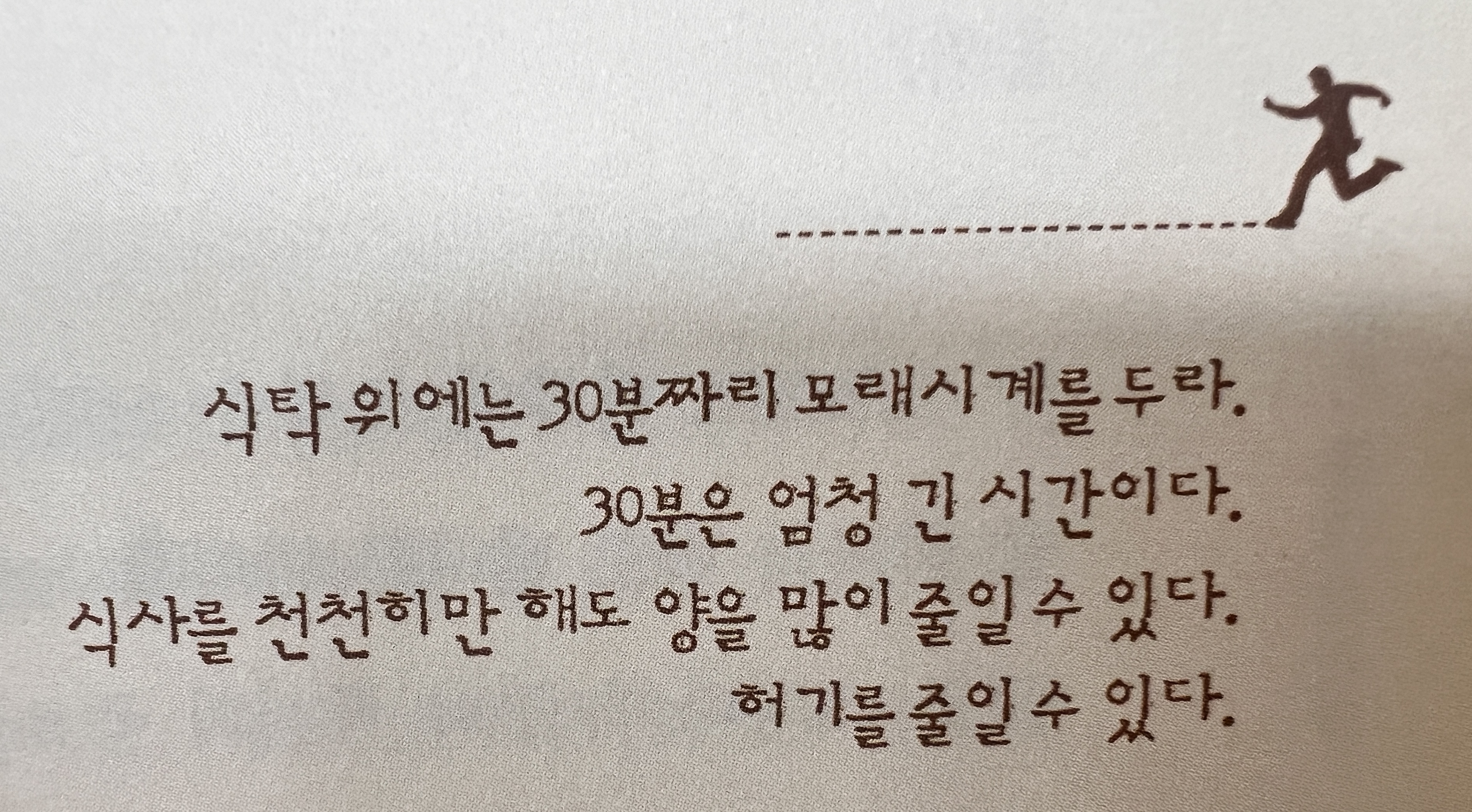 정말 맞는 말이다. 몸만이 현재다. 생각은 과거와 미래를 왔다갔다 한다. 하지만 몸은 늘 현재에 머문다. 현재의 몸만큼 중요한 것은 없다. 그렇기 때문에 몸은 늘 모든 것에 우선한다. 몸이 곧 당신이다. 몸을 돌보는 것은 자신을 위한 일인 동시에 남을 위한 일이다. 그런 면에서 몸을 관리하지 않고 방치하는 것은 무책임한 일이다. 직무유기다. 몸을 돌보지 않으면 가장 먼저 자신이 피해를 입는다. 이어 주변에 민폐를 끼친다. 몸을 돌보면 몸도 당신을 돌본다. 하지만 몸을 돌보지 않으면 몸이 반란을 일으킨다. 나는 그게 제일 두렵다.