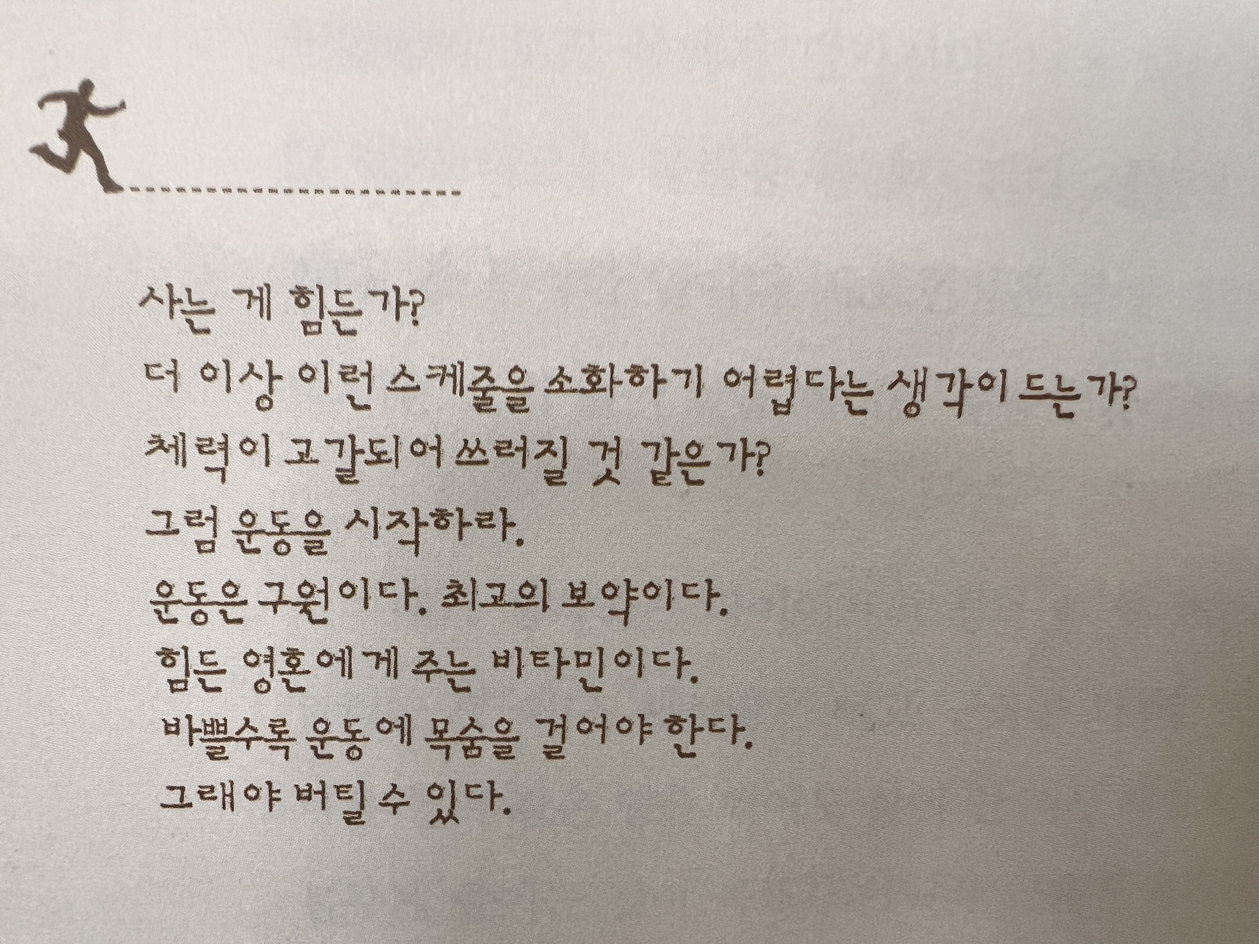 우리가 느끼는 몸의 변화는 우리 인생의 전환점이 될 수 있다. 현재의 몸 상태로 평생을 보내고 싶은가? 스케줄을 소화하기가 어려워지고 체력이 부족해지는 걸 느끼는가? 사랑하는 이들에게 더 나은 모습을 선사하고 싶은가? 그렇다면 운동을 시작해 보라. 돈보다도 몸을 더욱 소중히 여기는 습관을 길러라. 차를 버리고 걷거나, 뛰거나, 어떤 방식이든 몸을 움직여 보라. 정해진 시간을 운동에 투자하라. 그리고 기억하라, 운동은 우리 영혼에게 주는 최고의 비타민이다. 운동과 몸을 돌보는 것은 나를 사랑하는 사람들에게 바치는 가장 위대한 결심일지 모른다.