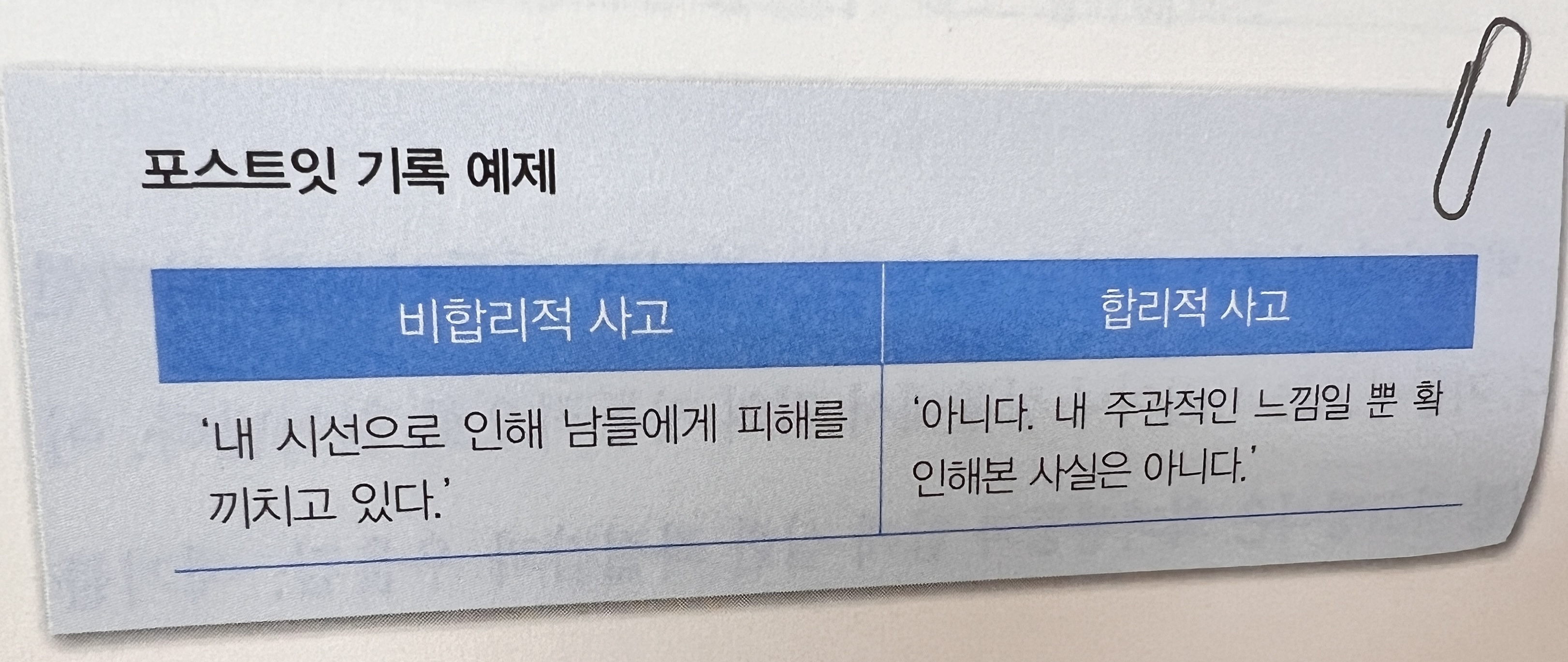 먼저 다음에 제시된 표처럼 포스트잇에 기록을 한다. 그리고 그것을 지갑 안이나 수첩 등 자주 열어보는 곳에 붙인다. 그리고 하루에도 여러 번 지갑을 열거나 수첩을 펼칠 때마다 순간순간 합리적 사고를 의식 선상에 떠올린다. 이런 과정이 반복되다 보면 비합리적인 사고는 점차 줄어들고, 합리적인 사고는 점점 커지게 된다. 변화는 나도 모르는 사이에 서서히 일어나게 된다.