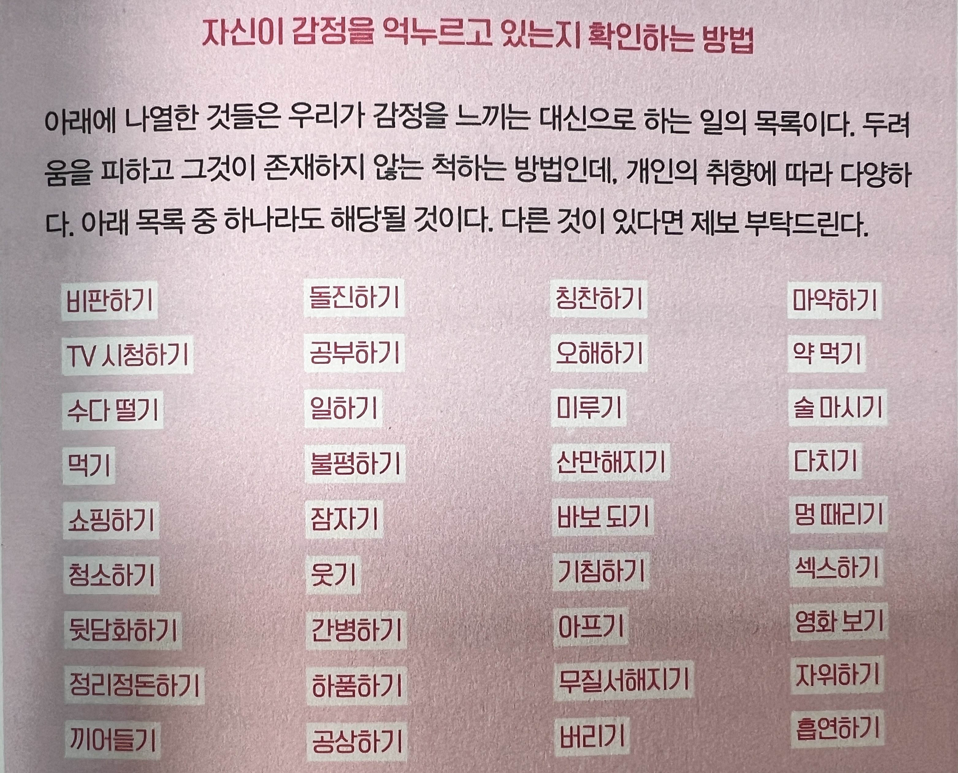 우리는 종종 불안을 감정적으로 피하고 억제하려 합니다. 불안은 무언가 잘못됐다는 신호로 받아들이기 쉽고, 이로 인해 많은 사람들이 불안을 해소하기 위한 방법을 찾기 위해