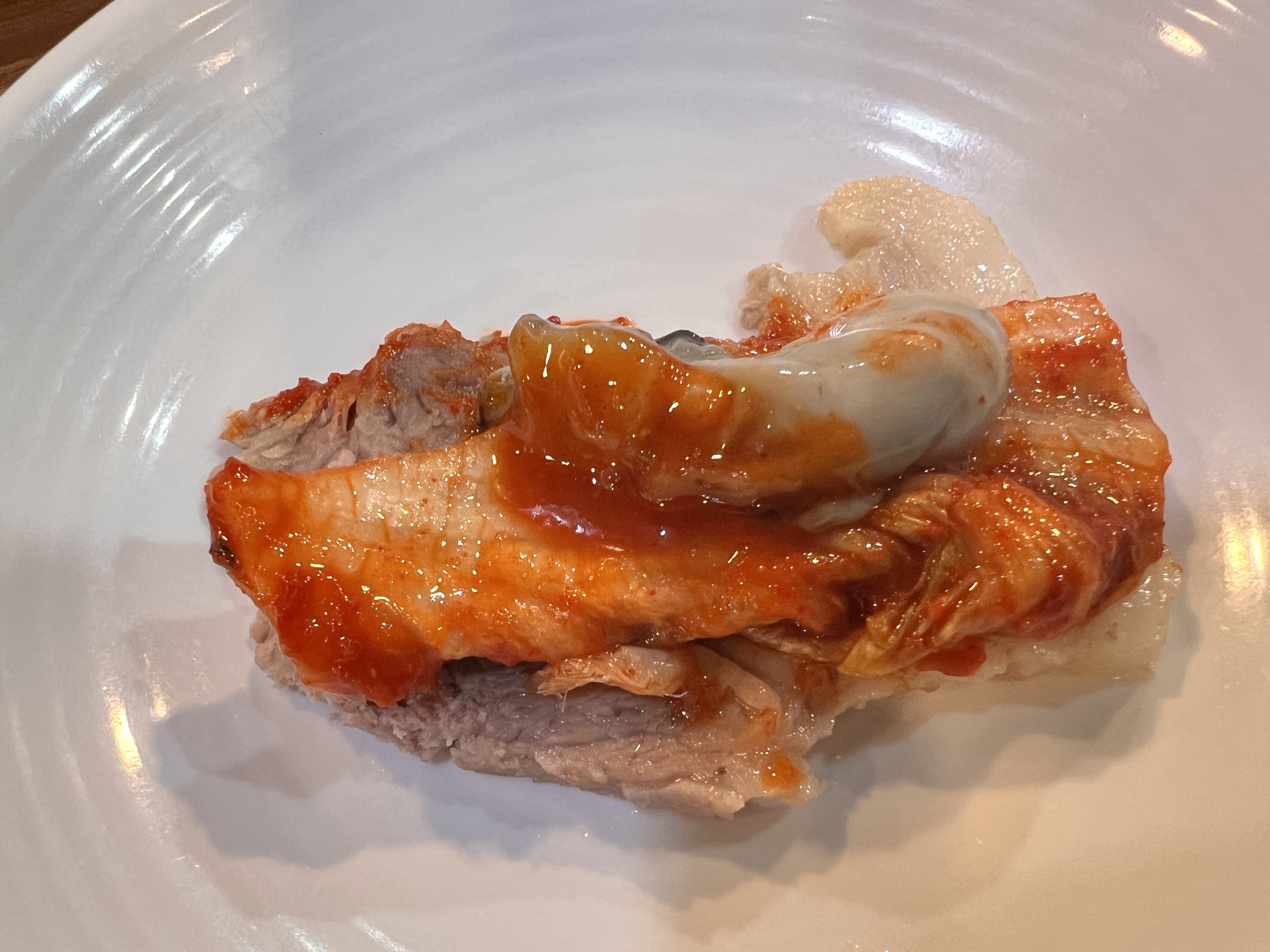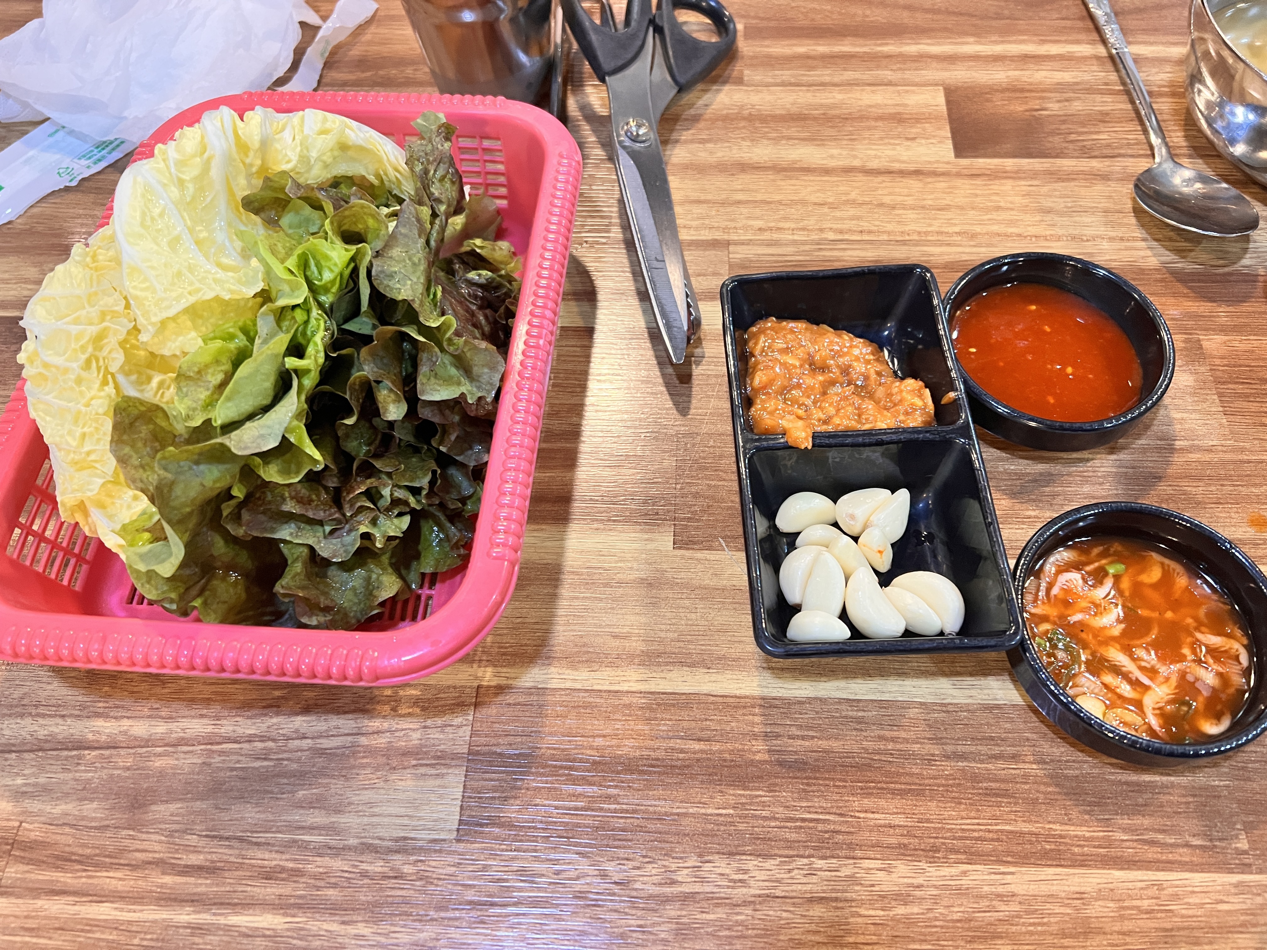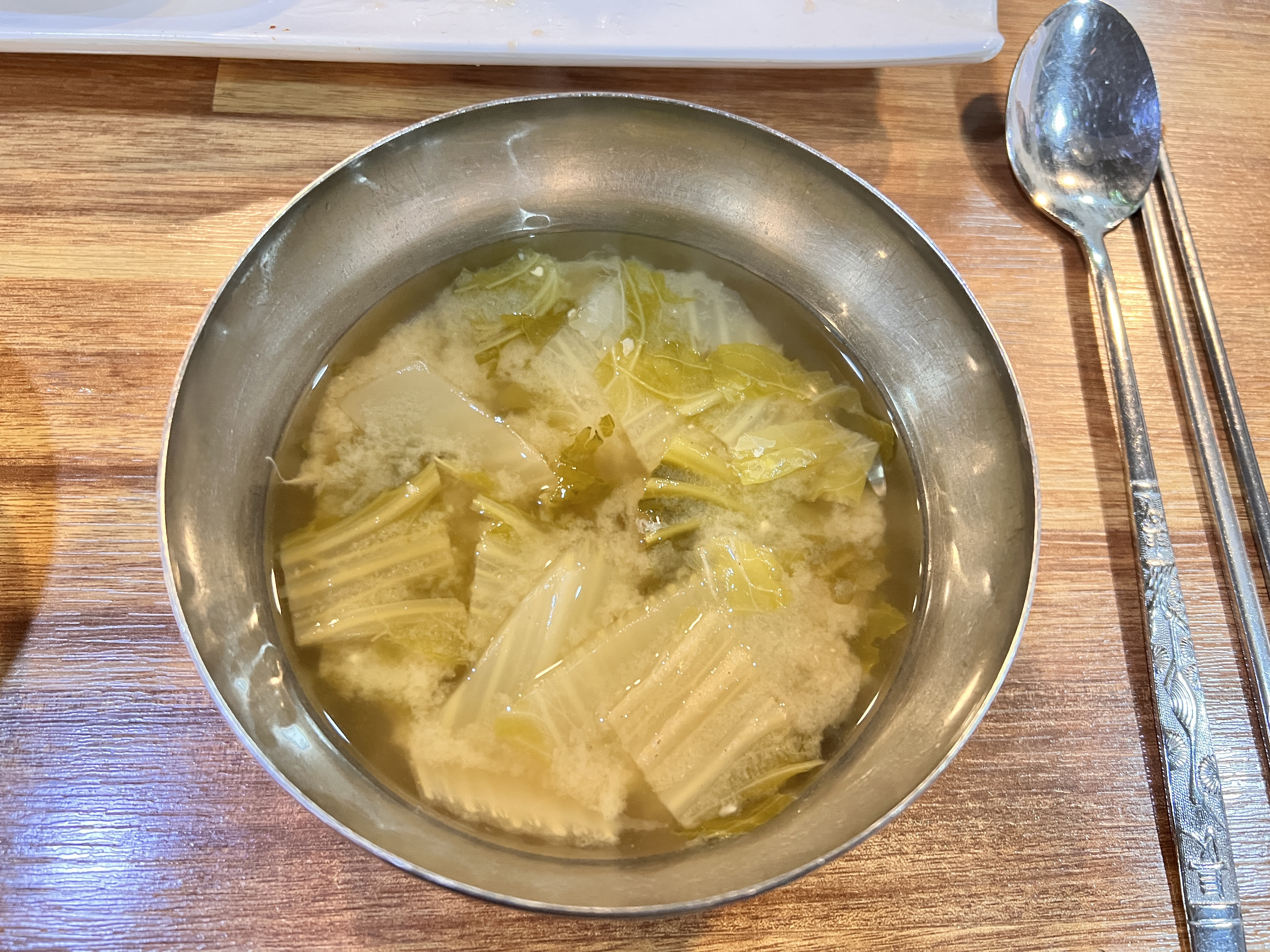 장군보쌈의 기본 보쌈도 맛있습니다. 오랜 세월 동안 많은 사람들의 사랑을 받아온 만큼, 보쌈 맛이 기본 이상이라는 평가를 받을 만합니다. 특히 보쌈을 먹을 때 함께 나오는 '배추국'이 참 인상적입니다. 보쌈을 계속 먹다 보면 약간 느끼하거나 짠맛이 강하게 느껴질 수 있는데, 그럴 때 배추국 한 그릇이면 입안을 개운하게 만들어 줍니다. 배추국 자체도 그 맛이 꽤 훌륭해서, 단순한 사이드 메뉴 이상으로 느껴집니다.
