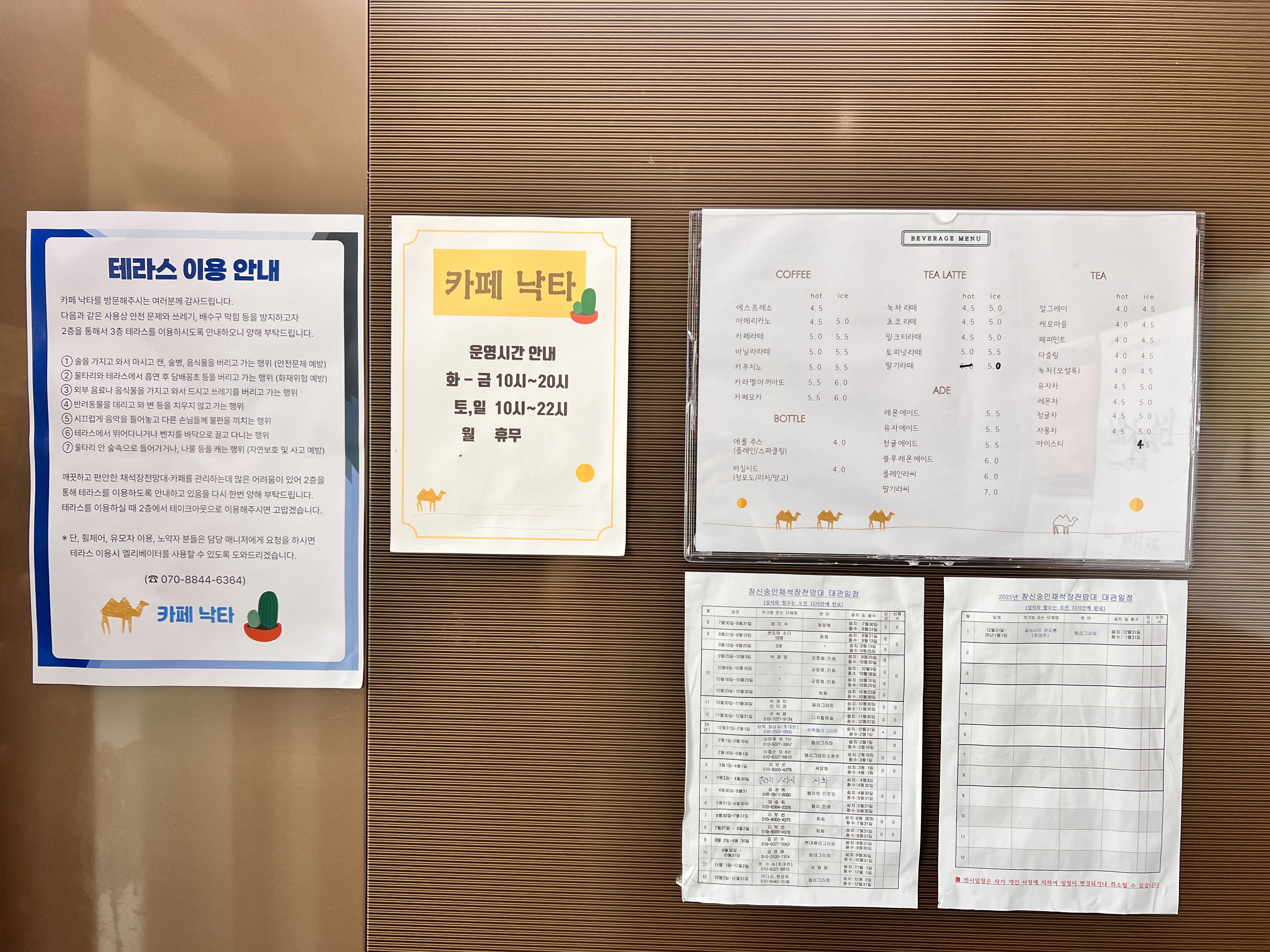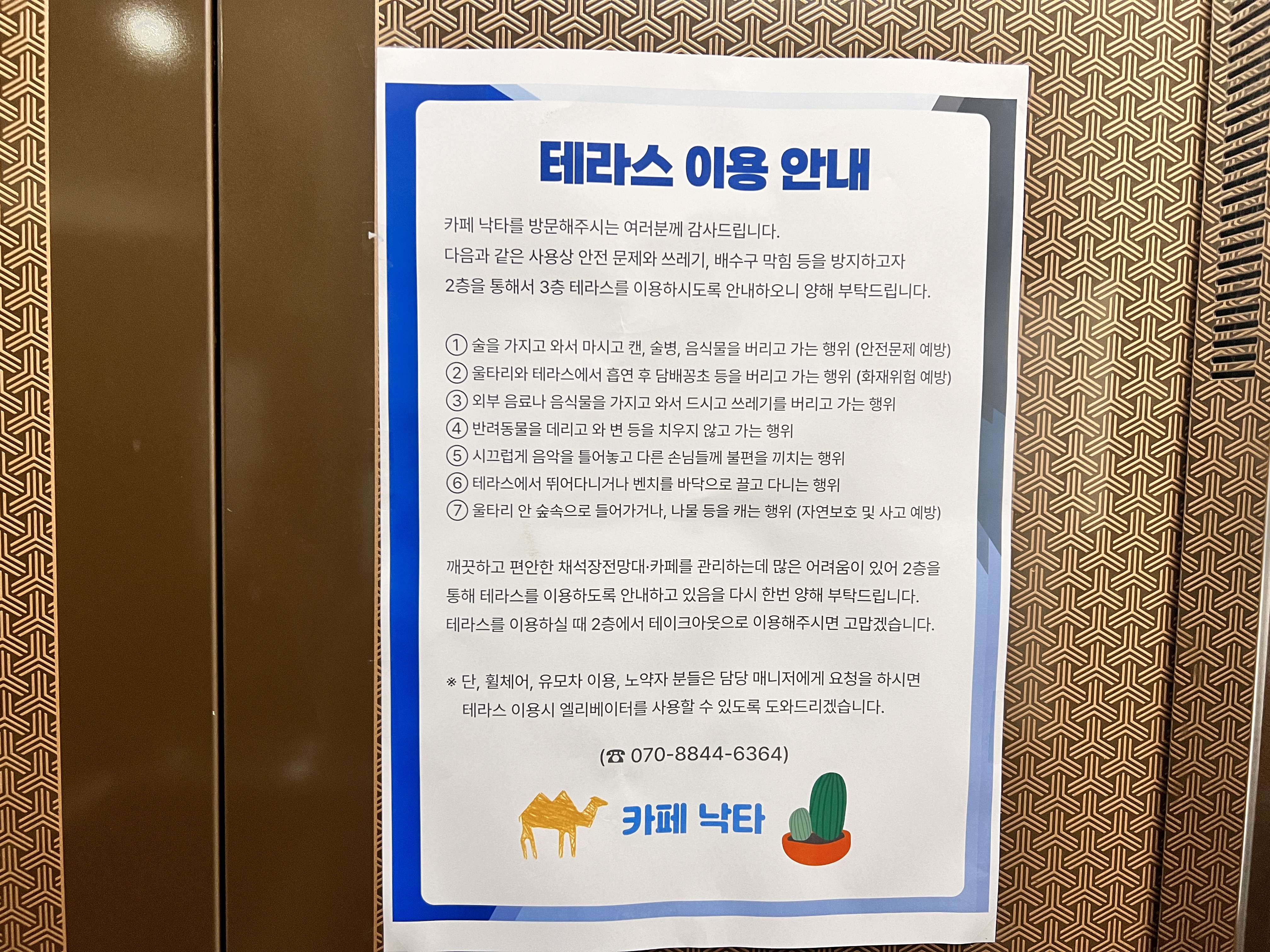 그럼에도 불구하고 언덕을 올라야 하기에 다소 힘들 수 있지만, 그 과정조차 이곳을 발견하는 특별한 여정의 일부가 되었다. 가파른 언덕을 오르며 느껴지는 적당한 피로감은 낙타카페에 도착했을 때의 기쁨을 더욱 크게 만들어 주었다. 철제 구조의 건물로, 엘리베이터를 타고 올라가야 하는 구조였다. 외관은 아늑하기보다는 차가운 느낌이 있었고, 내부에 들어가면 인테리어는 다소 간결했다. 이름과는 달리 '낙타'를 연상케 하는 소품은 없었지만, 창신동 꼭대기에 이런 철제 건물이 있다는 것은 신기했다. 전체적인 분위기는 조금은 차가운 철제 느낌이 강했다.