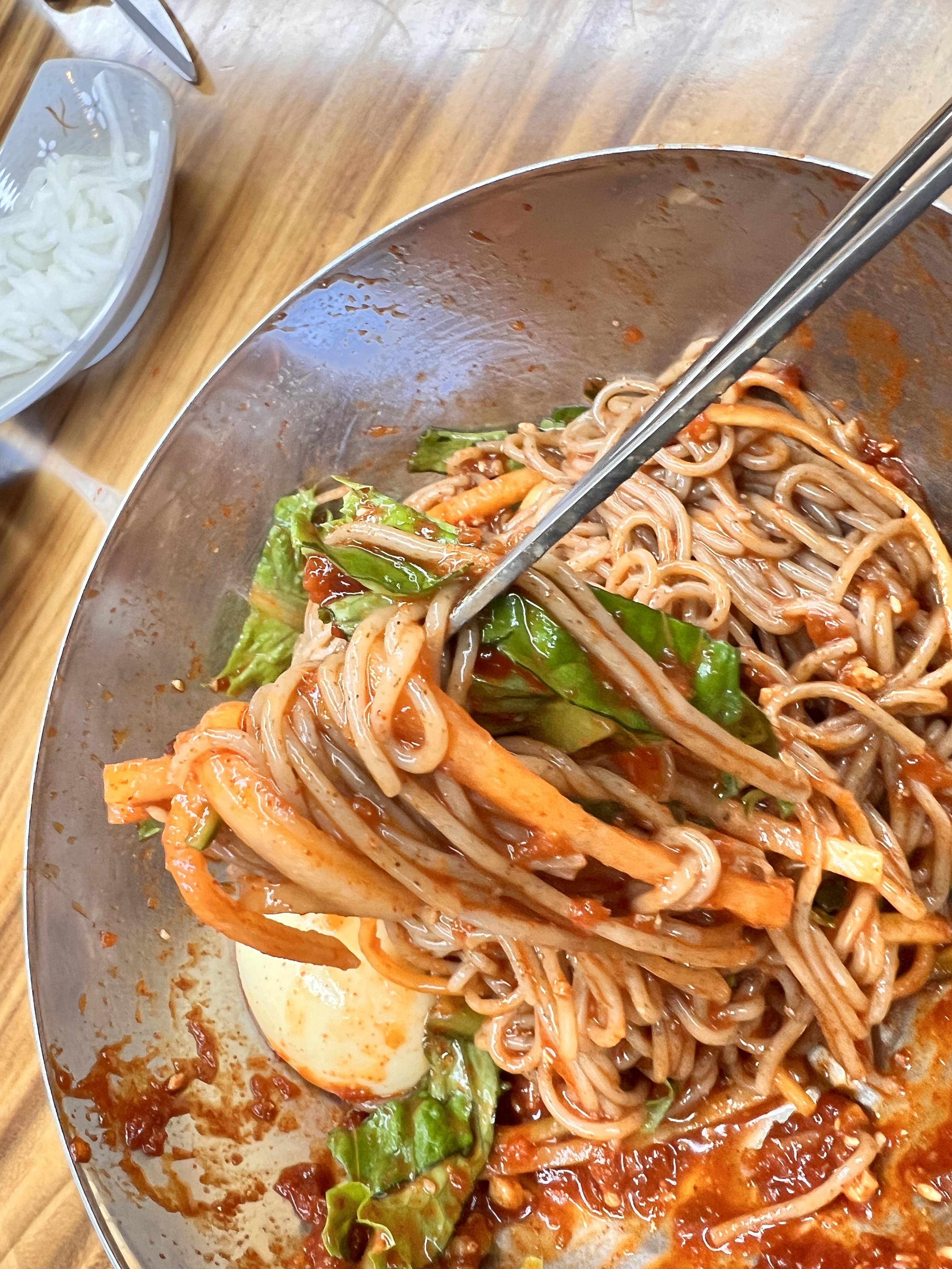 면은 정말 찰지고 쫄깃한 맛이 일품이었다. 보통 막국수는 면이 툭툭 끊어지는 느낌이 많지만, 이곳의 면은 약간 냉면의 면과 비슷한 느낌이었다. 밀도가 높고 쫄깃한 면이 양념과 잘 어울려, 식사 내내 만족스러운 맛을 선사해주었다.