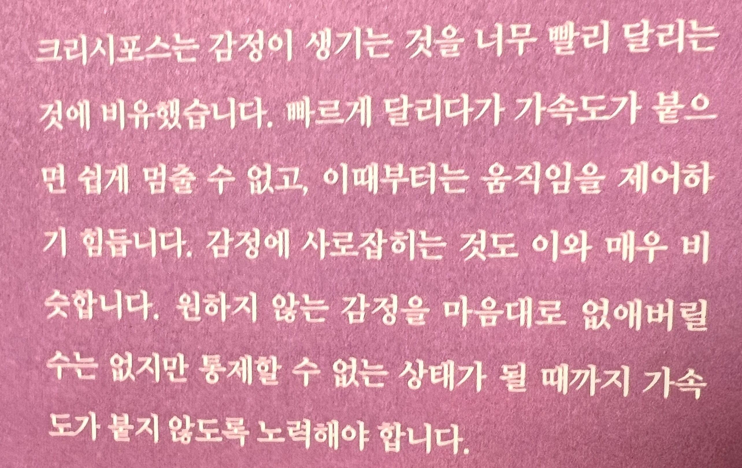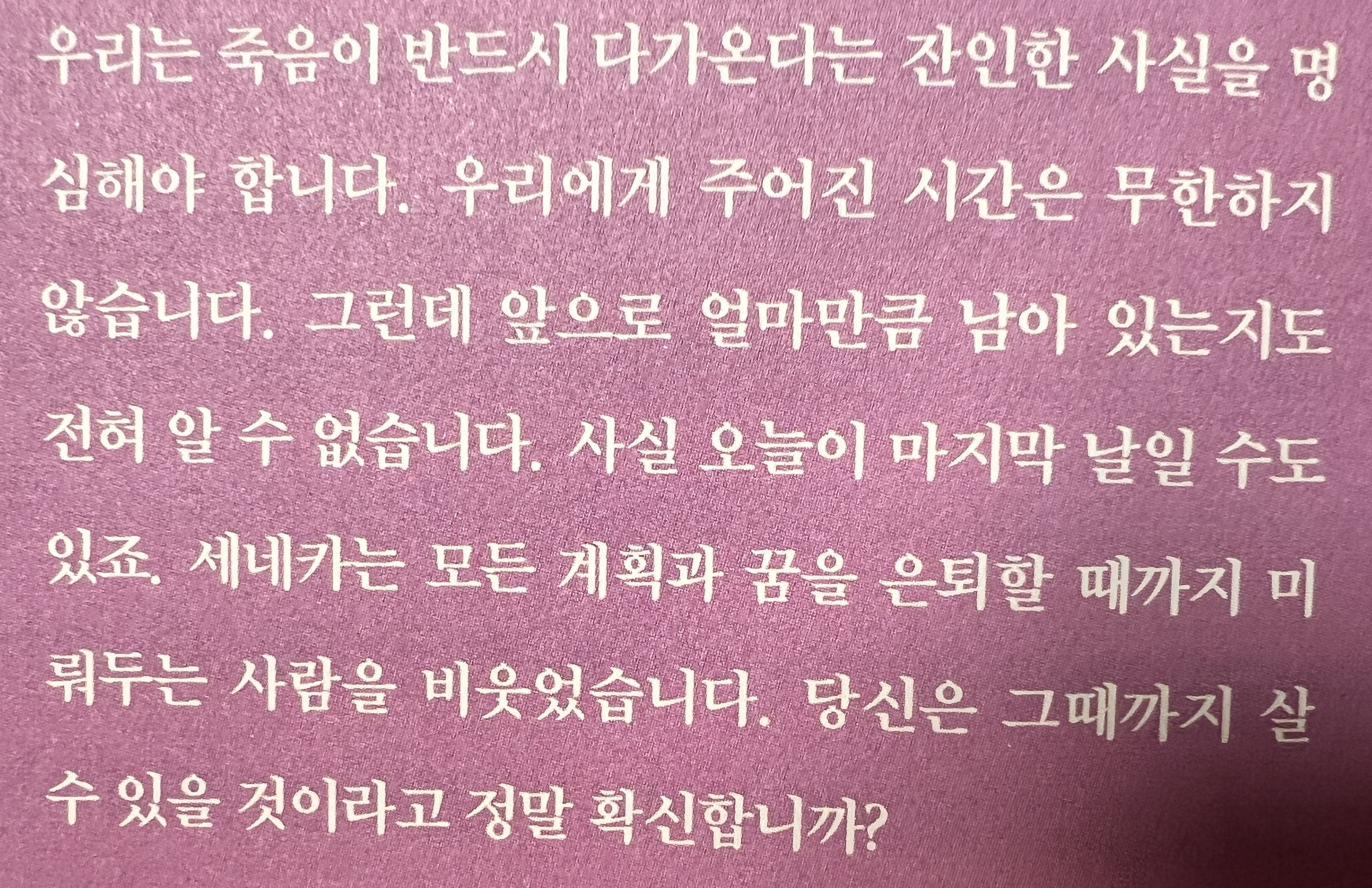 이 책을 통해 스토아 철학이 단순한 고대의 이론이 아니라, 오늘날에도 충분히 실용적인 지혜라는 사실을 깨닫게 되었습니다. 특히 "죽음을 기억하라"는 스토아 철학의 가르침은 삶을 더욱 진지하게 바라보게 만들었습니다. 우리가 흔히 겪는 불안과 좌절은 통제할 수 없는 일에 집착하기 때문이라는 점에서, 통제 가능한 것에만 집중하라는 스토아 철학의 메시지는 큰 위로가 되었습니다. 이 책은 단순한 철학적 이론을 넘어, 불안한 일상 속에서 평온을 찾고자 하는 현대인에게 강력한 도구가 될 수 있다고 생각합니다.